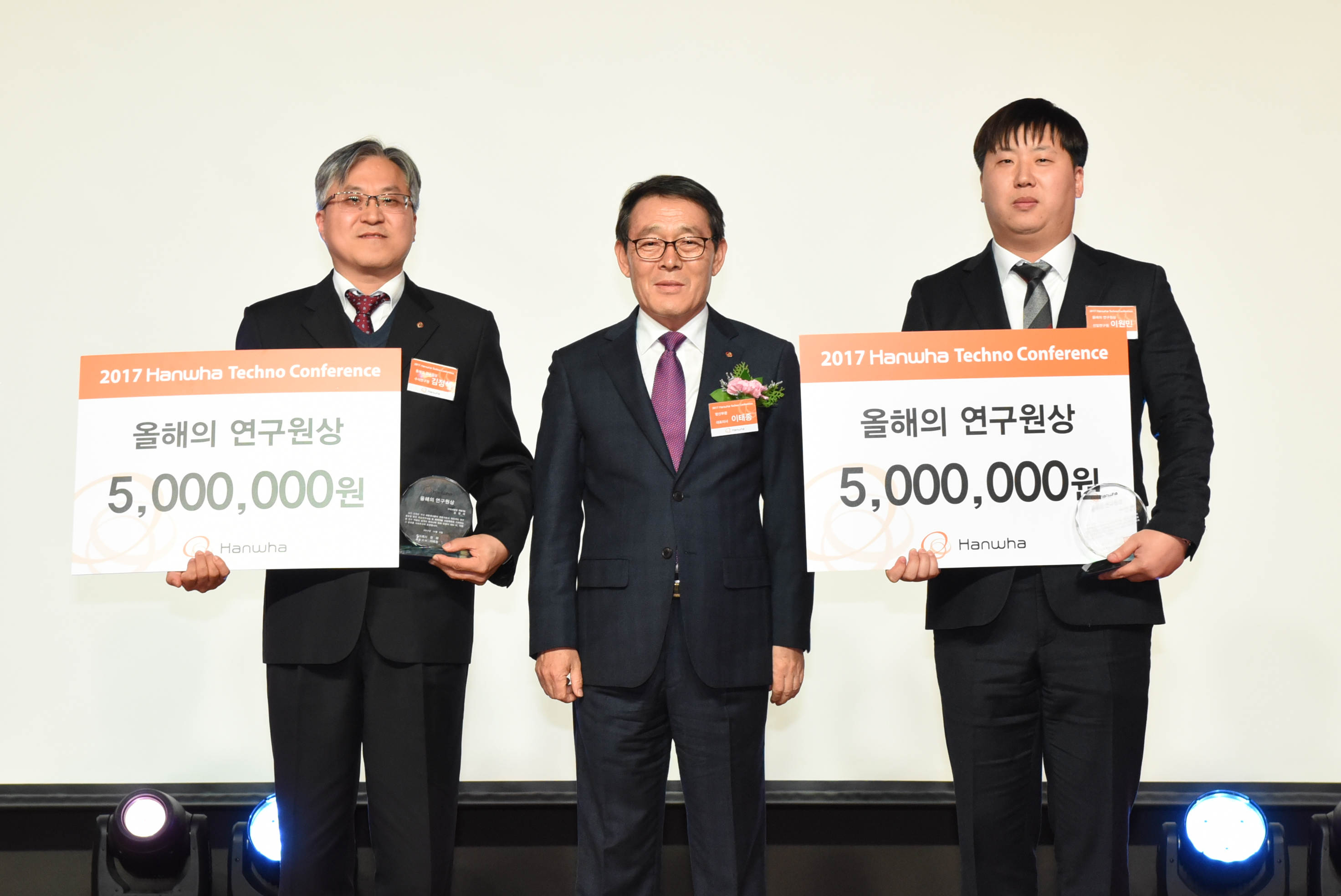 금번 테크노 컨퍼런스에서는 ㈜한화 이태종 대표이사와 ㈜한화 종합연구소 조항주 연구소장 등이 참석하여 올해의 연구원 2명, 한화기술상 8개 과제 36명, 우수논문상 2명 등 각 분야별 수상자 총 42명에 대해 시상했다.