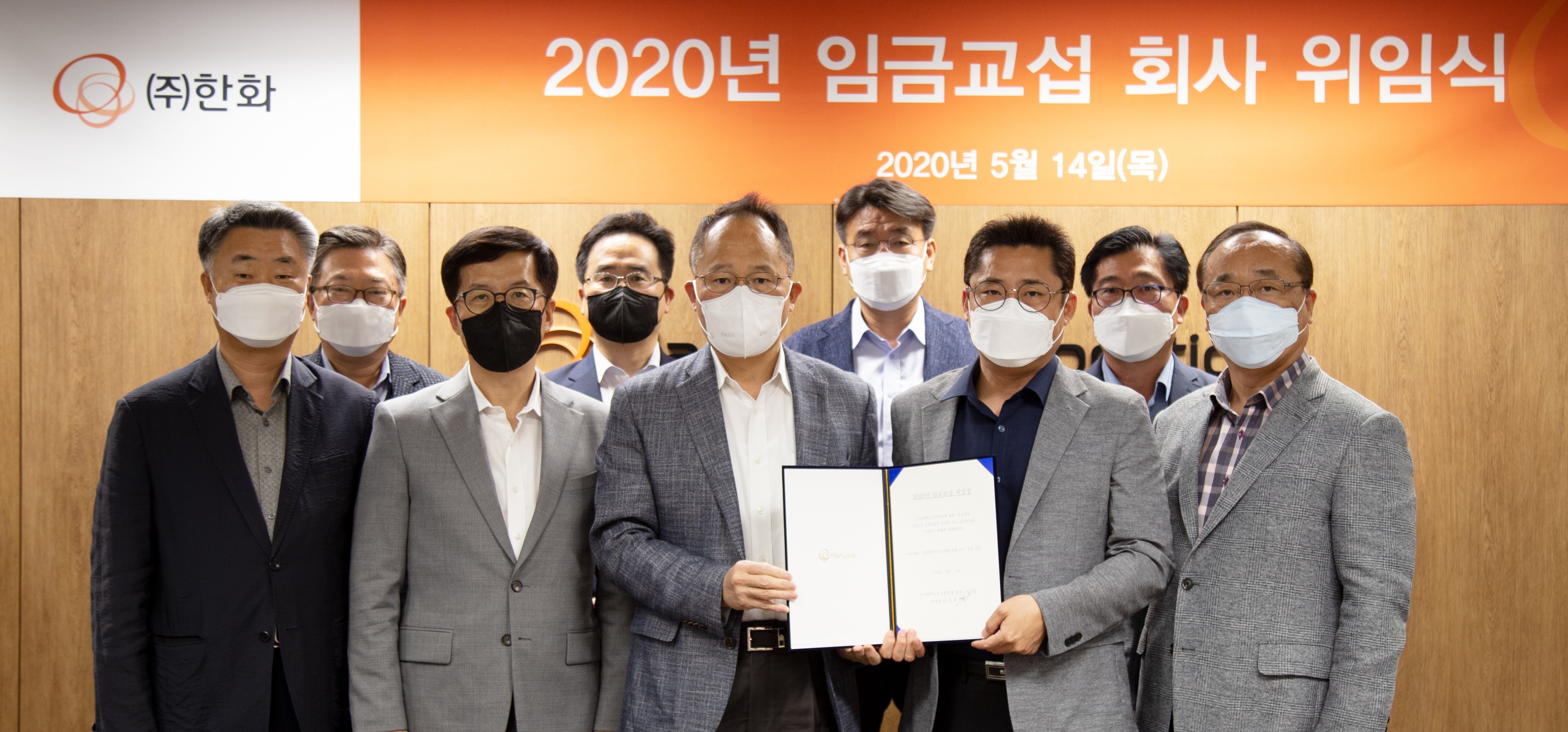 이번 위임식은 한화노동조합이 코로나 19 확산에 따른 대내외적 경영 위기를 상생의 노사문화로 극복하기 위해 대승적 차원에서 결정함에 따라 이뤄졌다.