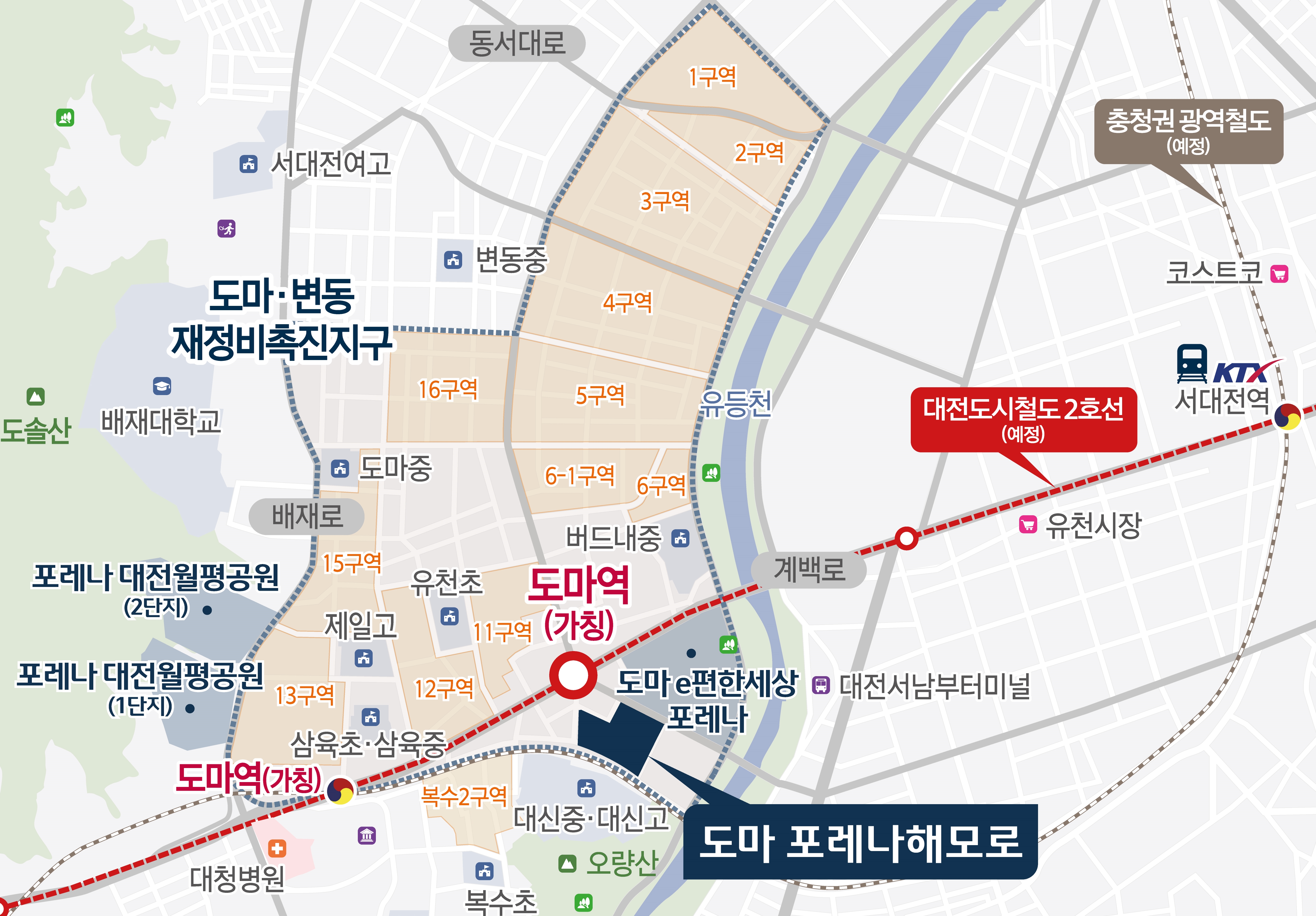 도마 포레나해모로가 들어서는 도마∙변동지구는 대규모 도시정비사업을 통해 도마 e편한세상 포레나(8구역), 호반써밋 그랜드센트럴(11구역) 등 2만5천여세대가 들어서는 브랜드 타운으로 변모 중이다. 이는 인근 도안신도시 1단계(2만4천여세대) 규모 수준이다.