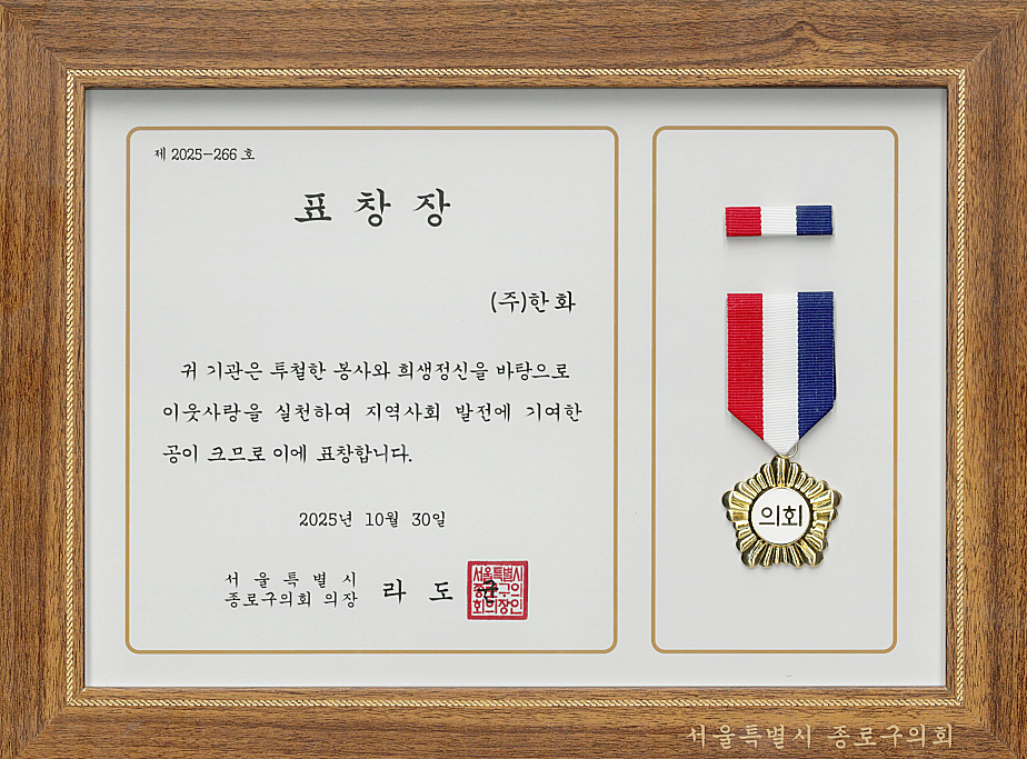 ㈜한화는 지난 10월 30일 서울특별시 종로구의회로부터 지역사회 내 복지기여에 대한 공로를 인정받아 표창장(구의장상)을 받았다.