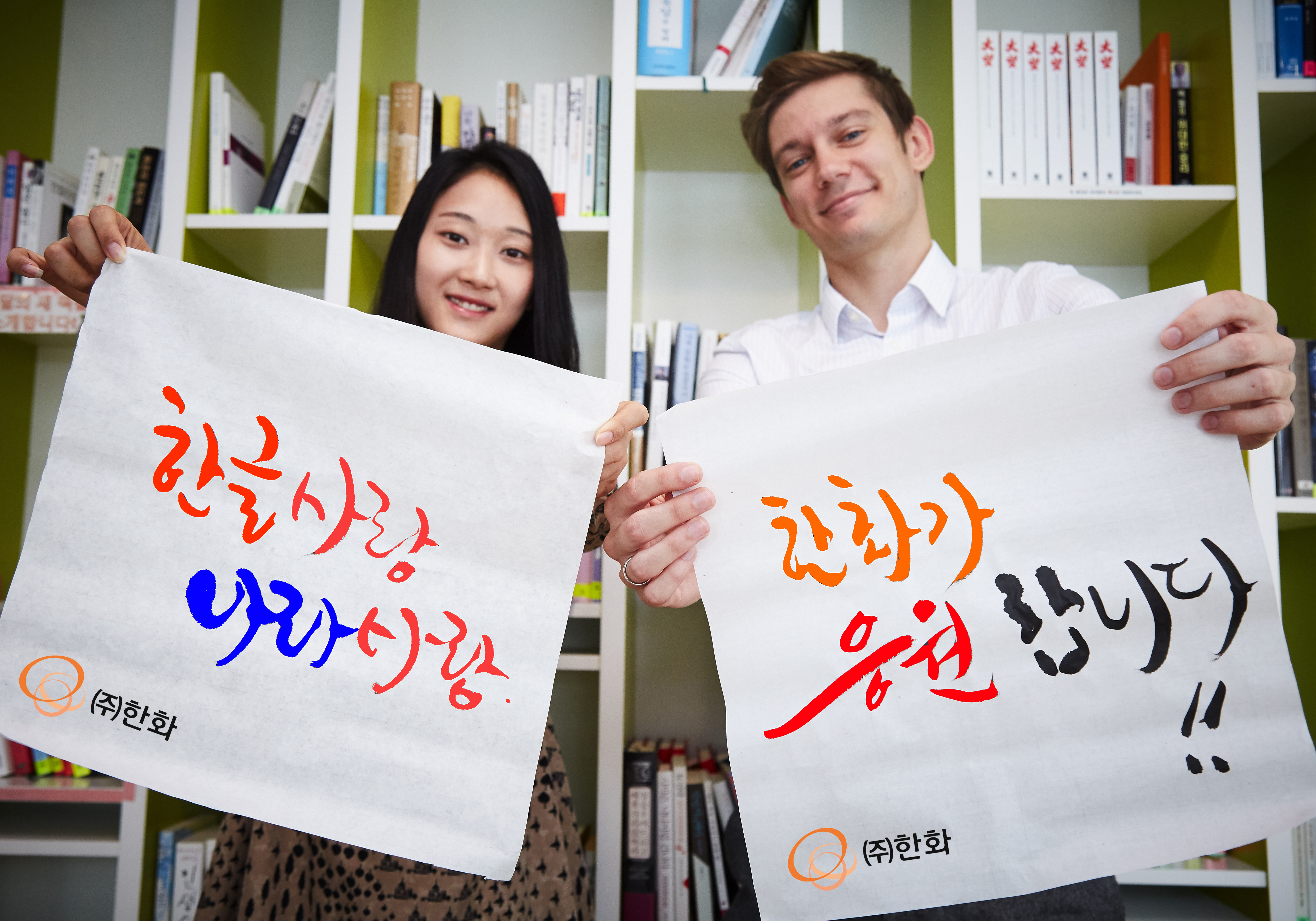 ㈜한화(대표이사 최양수)는 10월 6일 ㈜한화 본사(서울 중구 장교동 소재)에서 10월 9일 한글날을 맞이하여 임직원들에게 캘리그라피(Calligraphy, 아름다운 서체란 뜻을 지닌 그리스어 Kalligraphia에서 유래된 말로 ‘손으로 그린 그림문자’를 의미)를 통해 한글의 아름다움과 우수성을 알리는 시간을 마련하였다.